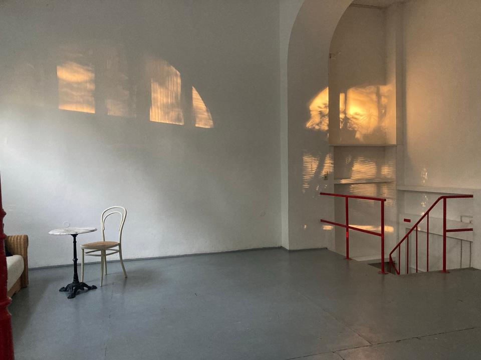 Ca. 20 qm mit hohen Decken und viel Tageslicht, schlicht möbliert, offene kleine Küche.
